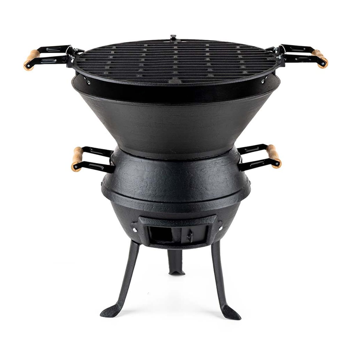 • Чугунено барбекю с дървена дръжка, регулируема по височина.